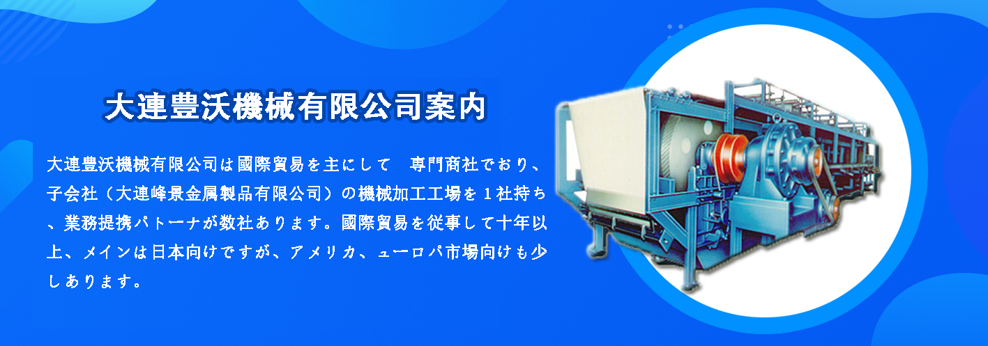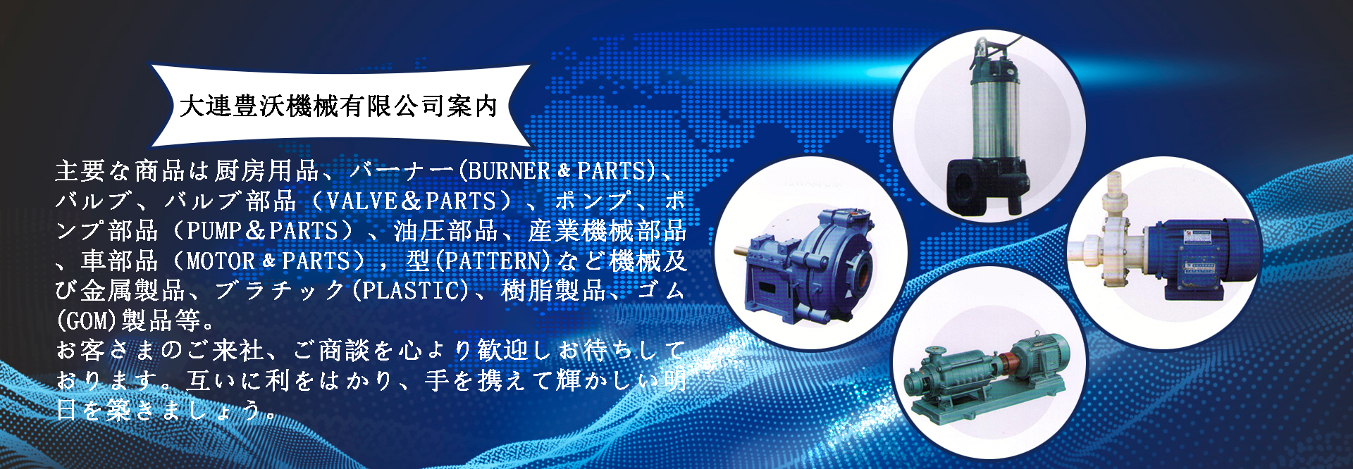 大連豊沃機械有限公司は國際貿易を主にして 専門商社でおり、子会社の機械加工工場を1社持ち、業務提携パトーナが数社あります。國際貿易を従事して十年以上、メインは日本向けですが、アメリカ、ューロパ市場向けも少しあります。砂鋳造(CASTING)(FC,FCD,FACD,ADI)、ロストワックス(LOST-WAX)、鋳鋼(SC,SCS)、ステンレス(SUS)、ダイカスト(DIE-CASTING)(アルミ、真鍮)、鍛造(FORGING)、プレス(PRESS)、製缶(WELDING)など幅多く分野ております。主要な商品は厨房用品、バーナー(BURNER﹠PARTS)、バルブ、バルブ部品(VALVE&PARTS)、ポンプ、ポンプ部品(PUMP&PARTS)、油圧部品、産業機械部品、車部品(MOTOR﹠PARTS),型(PATTERN)など機械及び金属製品、ブラチック(PLASTIC)、樹脂製品、ゴム(GOM)製品等。
